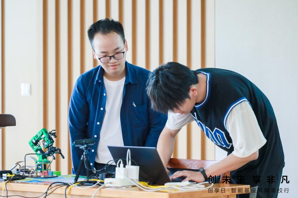 训练营环节,华为昇腾AI高级工程师张孟航介绍了华为将要发布的Atlas 200l DK A2深度学习边缘计算开发者套件,讲解了基于昇腾开发者套件动手组装的机械臂抓取应用的案例,激发了广大同学浓厚的学习兴趣。现场还进行了机械臂演示及互动体验活动。