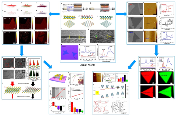 该科研团队经过精确调控化学气相沉积(CVD)系统中的氢气等离子体处理工艺,将二维层状半导体材料MoS2的上层S原子,逐步替换成H原子,并且保持下层S原子晶格不受破坏,该过程必须精确控制相关参数,包括氢气等离子体功率﹑时间﹑气压等。研制出的单原子层MoSH,采用飞行时间二次离子质谱仪(TOF-SIMS),高分辨透射电镜(HRTEM),扫描电子显微镜(SEM),原子力显微镜(AFM),拉曼光谱(Raman),光致发光光谱(PL),以及开尔文探针力显微镜(KPFM),场效应晶体管(FETs)器件测试等微观与介观技术,进行了系统性的表征。研究表明,MoSH是费米面位于其导带内的金属性二维单原子层,其本征载流子浓度高达∼2 × 1013cm−2。该研究成果精确定位了研制Janus MoSH的生长窗口,并给出了对器件应用具有重要意义的基本电学参数;此外,金属性的2D Janus MoSH有望成为观察中红外区域表面离子体共振(SPR)的新型平台。