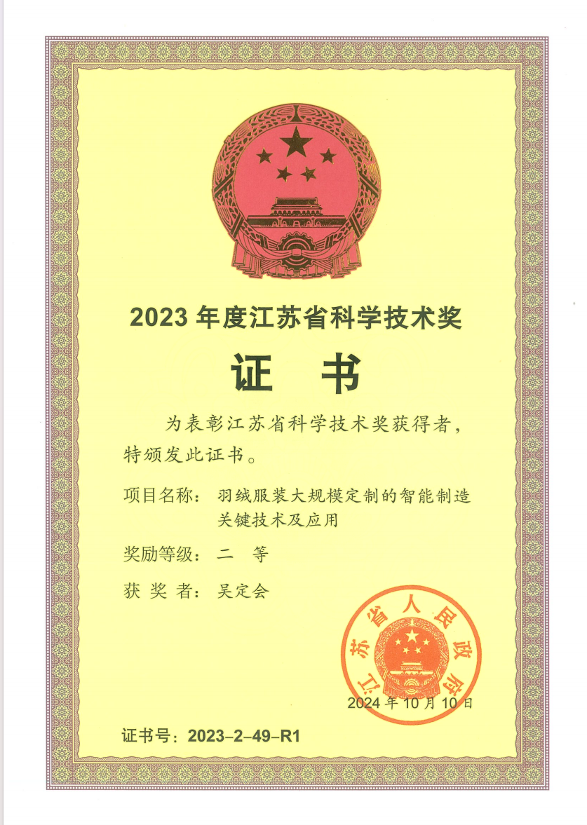 11月7日,江苏省科技大会暨省科学技术奖励大会在南京召开,评选了2023年度江苏省科学技术奖、青年杰出贡献奖、企业技术创新奖和国际科学技术合作奖,对科学技术进步、经济社会发展作出突出贡献的科学技术人员和组织进行表彰。bwin·必赢唯一官网吴定会教授牵头完成的“羽绒服装大规模定制的智能制造关键技术及应用”项目荣获江苏省科学技术奖二等奖。