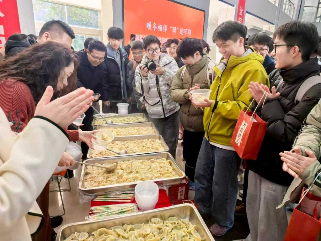 Bwin必赢领导同班主任、辅导员老师为考研同学们送上学院精心准备的专属慰问礼包,每一件物品都蕴含着巧思与祝福,承载着学院对考研学子们的深切祝福和温暖关怀。印有姓名的定制可口可乐,寄托"独占鳌头"的期许;好丽友派象征研途挚友的温暖相伴;文具套装寓意"笔下生花"的才思泉涌;棒棒糖传递"越来越棒"的甜美祝愿;旺仔牛奶糖带来好运加持的活力能量;"纸定有你"便签本镌刻着金榜题名的坚定信念;更有一封来自辅导员满载温情的加油信,以“稳住心态、智慧冲刺”的贴心指导,为学子们注入了坚定的精神力量。活动现场,Bwin必赢领导和老师们为考研学子分发了热腾腾的饺子,饺子寓意“骄子”,愿同学们能够不惧困难,踏实前行,终成“骄子”。