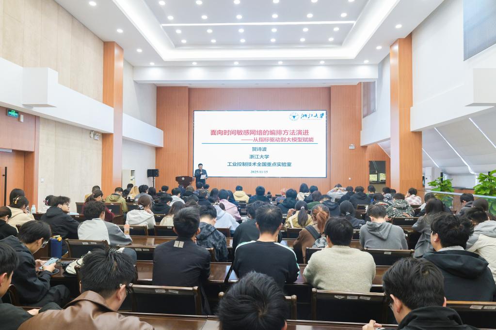 近日,江南讲坛第151期在bwin·必赢唯一官网D328举行。浙江大学求是特聘教授贺诗波应邀作题为《面向时间敏感网络的编排方法演进:从指标驱动到大模型赋能》的专题报告,吸引了150位本硕学子聆听。活动由副院长王子赟主持。