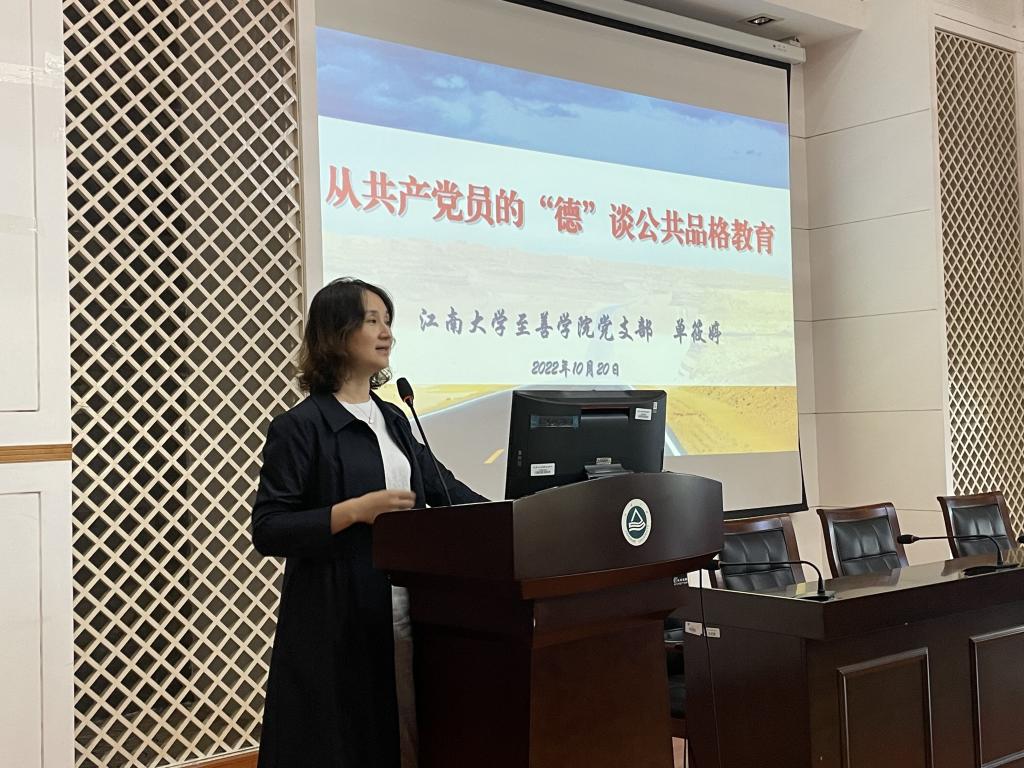 10月20日下午,bwin·必赢唯一官网党委特邀至善学院副院长单筱婷讲授“从共产党员的‘德’谈公共品格教育”主题党课。学院150余名师生在学院D328会议室聆听了本次党课。活动由辅导员李灿主持。