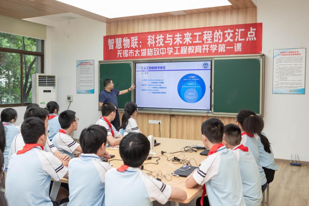 吴定会以“人工智能技术与智慧教育”为题为初二(1)班的同学们带来一堂精彩的科普课程。他用深厚的学养、扎实的理论、详实的数据、鲜活的案例从人工智能技术的定义和基本概念讲起,引导同学们了解人工智能在教育领域的应用。他详细解释了机器学习、深度学习、自然语言处理等重要的人工智能技术,并向同学们展示了如何利用这些技术来提高教育质量和效率。他鼓励同学们积极探索人工智能领域,架构起与其他工程领域之间的桥梁,并尝试利用这些技术来解决实际问题。