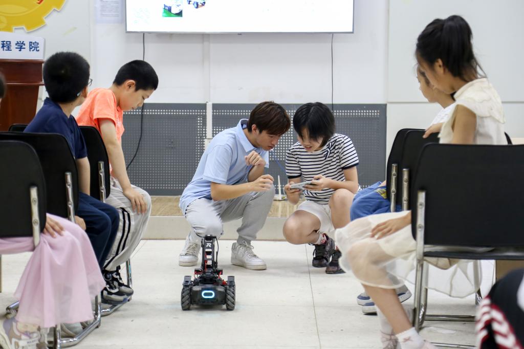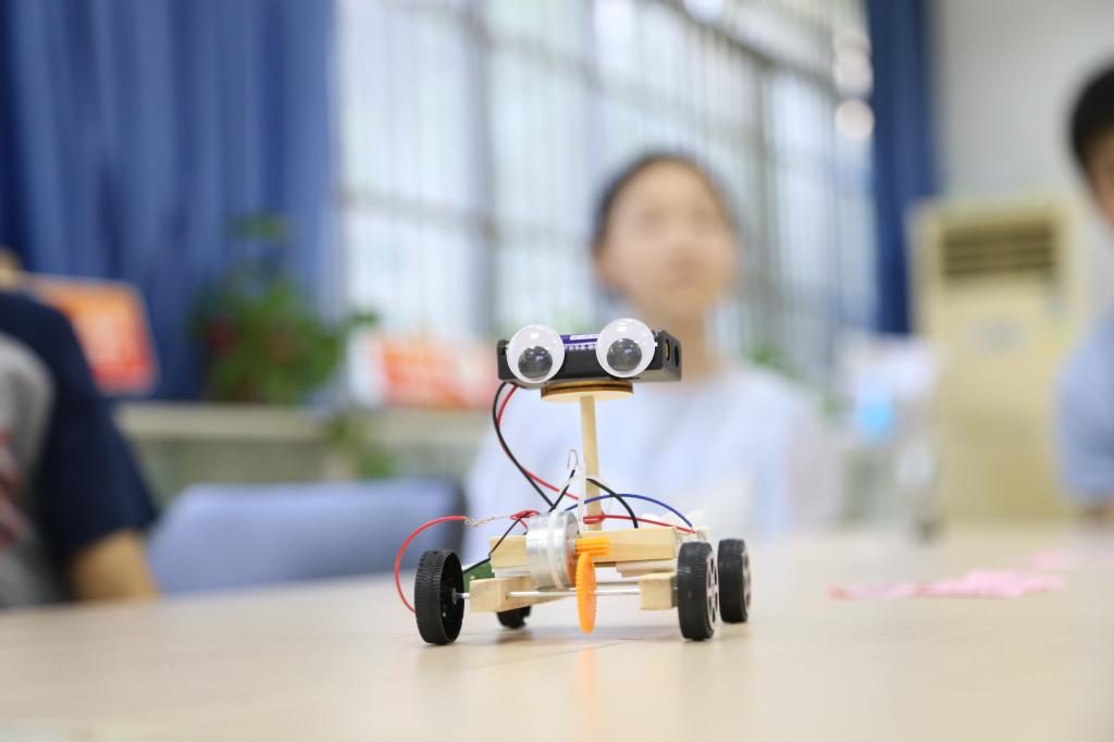 为了让小朋友们更真实地体验芯片的科技之美,现场设置了“声控智能小车”的动手实践环节,在志愿者的指导下亲身探索芯片奥秘。组装车架、对接电线、黏贴芯片模组、固定齿轮、安装电池,小朋友五人一组,如火如荼地动手“施工”。伴随着此起彼伏雷鸣般的掌声,智能车应声而动、徐徐前进,车顶的芯片骄傲的向众人展示它的神奇科技“魔法”。接着,由bwin·必赢唯一官网智能车俱乐部自主研发的作品——“无线智能机械臂小车”压轴登场,原地360度转弯、横向纵向平移、机械臂抓取矿泉水瓶,一套套“高阶”操作不断刷新小朋友们对芯片的认知,过了一把“含金量”十足的芯片“瘾”。