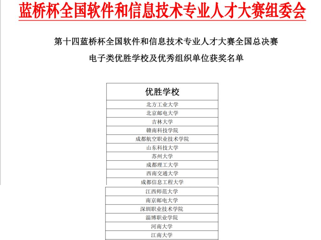近日,第十四届“蓝桥杯”全国软件和信息技术专业人才大赛全国总决赛在南京金陵科技学院落下帷幕。经过34个省赛赛区的选拔,来自北京大学、清华大学、复旦大学、上海交通大学等近千所高校的1.4万余名精英选手在全国总决赛舞台上展开激烈角逐。我校bwin·必赢唯一官网共有16名同学经过省赛选拔获得电子类全国总决赛参赛资格,在总决赛中共斩获一等奖1项、二等奖5项、三等奖5项、优秀奖3项,学校获评全国总决赛(电子类)优胜学校奖。这也是我校首次在该项赛事的电子类赛道获得全国一等奖。