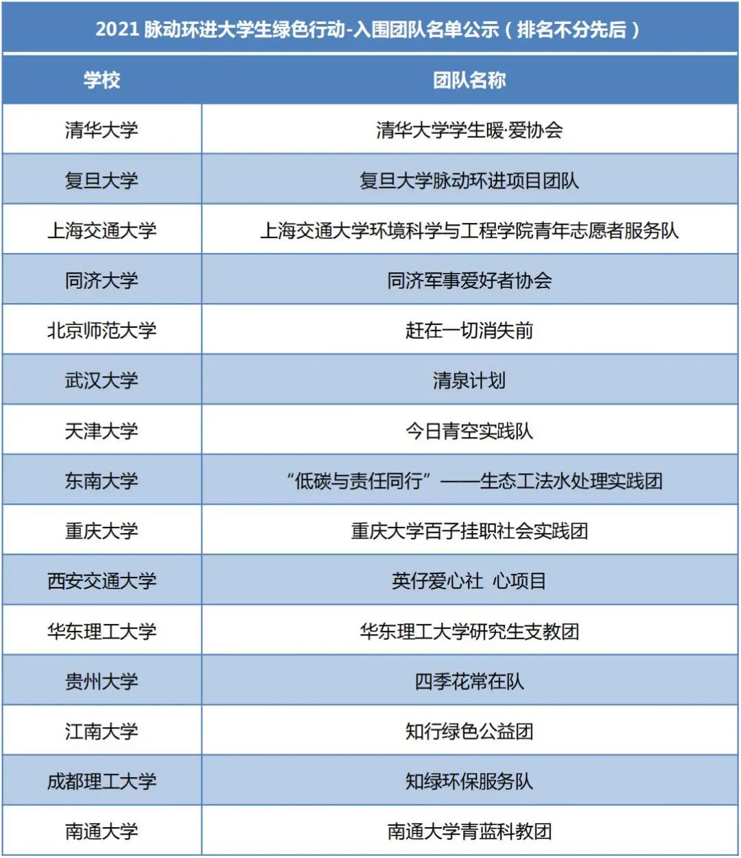 2021年“美丽中国,青春行动”脉动环进大学生绿色行动由知行计划、中国光华科技基金会、达能中国饮料联合发起,该活动积极响应共青团中央“美丽中国,青春行动”号召,围绕资源节约议题,鼓励大学生开展“绿色工坊”及“绿色行动”,引导大学生群体带动社会共同助力生态文明建设,推进绿色可持续发展,共建美丽中国。本次活动自4月启动以来,来自全国各大高校的150支大学生团队以“水资源保护”“包装物的再回收利用”“闲置物品再回收利用”等为主题纷纷发起绿色环保行动。