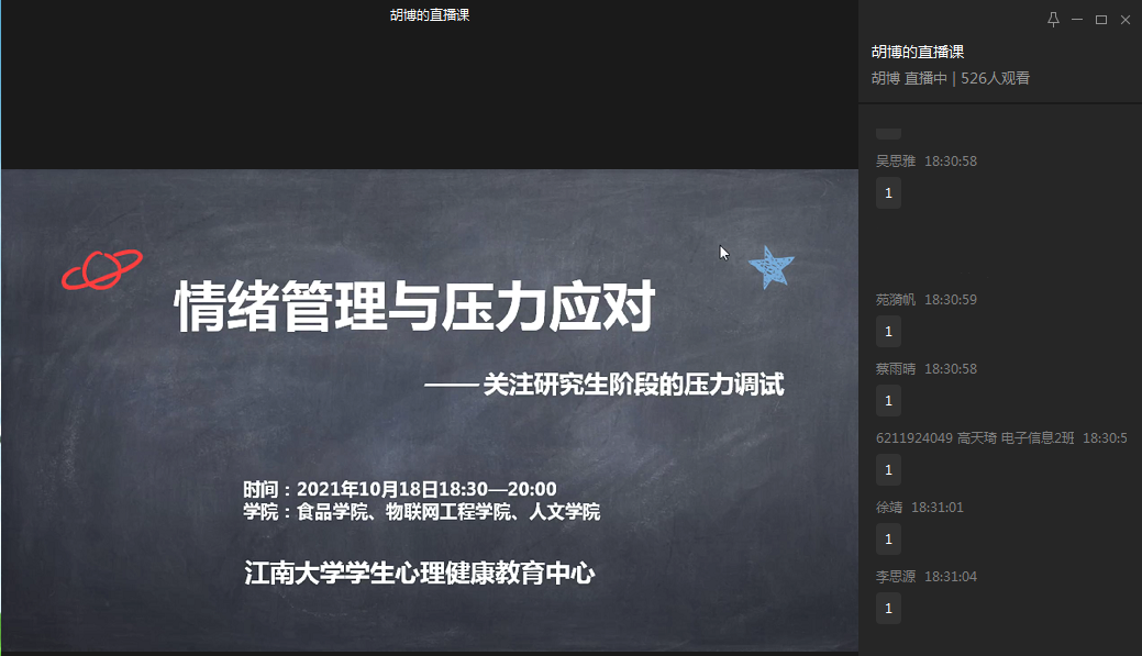 为进一步提高研究生群体心理健康意识,10月18日晚,bwin·必赢唯一官网通过企业微信平台举办线上研究生新生心理健康教育讲座。本次讲座学院特意邀请了生物工程学院老师胡博做《情绪管理与压力应对》主题分享,学院2021级全体硕博生参加了活动。