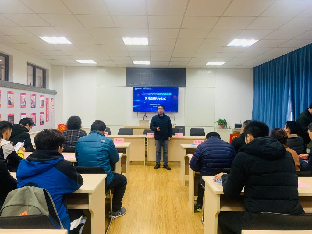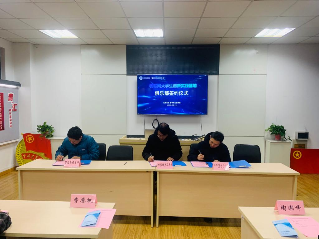 为进一步推进学院调整后物联网大学生创新实践基地建设,加强和规范基地创新俱乐部的管理,为学生课外创新实践创设更好的条件。近日,bwin·必赢唯一官网大学生创新基地优化工程启动活动——大学生创新实践基地俱乐部签约仪式在bwin·必赢唯一官网C121会议室举行。bwin·必赢唯一官网副院长陶洪峰、学院大创基地负责人费赓柢、分团委书记吴垚、辅导员屈跃宽及创新俱乐部责任指导老师、俱乐部学生代表出席本次签约仪式,仪式由费赓柢主持。