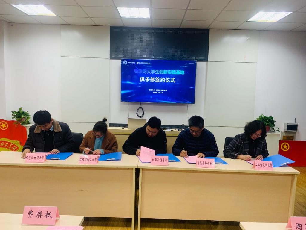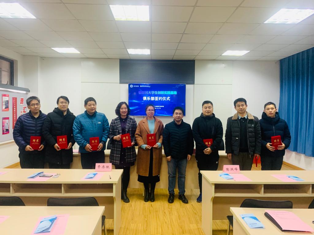 签约仪式上,费赓柢简要介绍了物联网大学生创新实践基地的基本情况,强调了基地实验室安全及管理制度。俱乐部责任指导老师分别签订《物联网大学生创新实践基地俱乐部设立协议书》,陶洪峰副院长向各俱乐部责任指导老师颁发了聘书,并与俱乐部负责老师进行交流。他向各俱乐部提出了三点希望,一是希望通过俱乐部积极进行创新实践教学体系的探索与实践,使学生的学习从“被动学习”、“独立学习”转变为“主动学习”、“创新学习”和“合作学习”;二是希望通过俱乐部进一步提升我院学科竞赛的水平,让学科竞赛引领学生成长。三是希望积极开展丰富多彩的科创活动,通过举办学术沙龙、科普讲座等活动,营造良好的创新创业氛围。