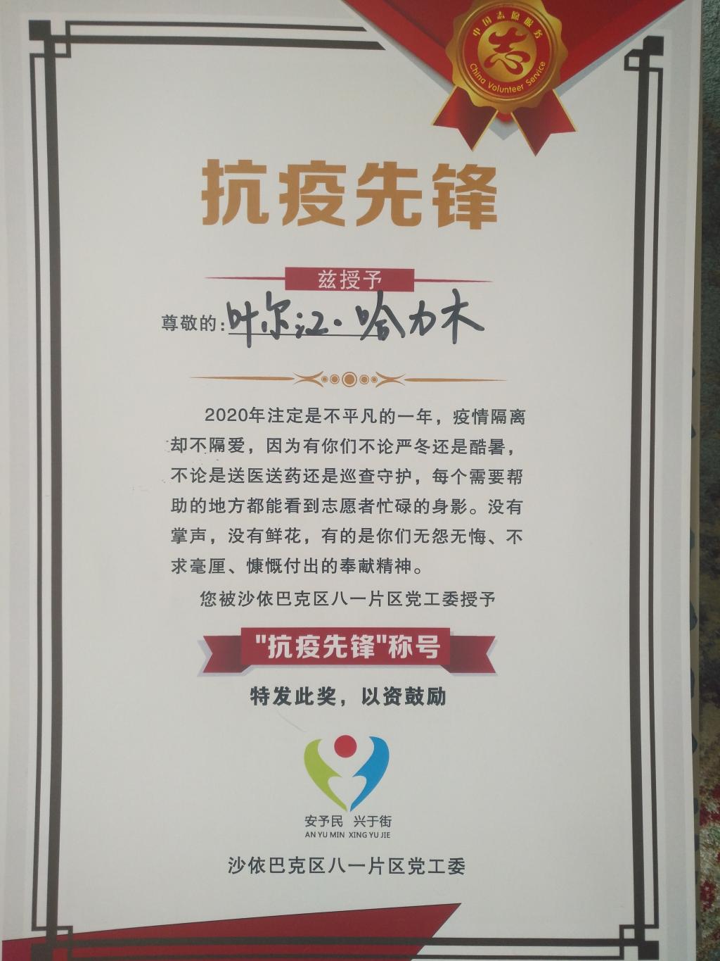 在新冠肺炎疫情肆虐的当下,为确保居民群众健康和生命安全,7月17日起乌鲁木齐市采取了严格的封闭式管理,小到每家每户,大到整个社区,整个小镇。叶尔江·哈力木家住在乌鲁木齐市沙依巴克区八一片区农大社区,也是乌鲁木齐疫情爆发的重灾区之一。炎炎夏日,他充当“好门禁”、“小管家”、“配菜工”、“送货员”、“小厨师”、“快递哥”、“清洁工”等多种角色是这个特殊43天的真实写照。“无所不能”的他每天忙碌于楼栋值班,为楼内居民购买食材及日用品,并送货上门;帮助楼内病人购买急需药品并第一时间送达;对楼内所有居民一天三次测量体温;对楼内公共区域每天定时消杀,清洁、为居民发放药物、每天定时上门收楼内所有住户生活垃圾,并投放指定地点,社区维持核酸检测现场秩序,帮助社区汇总、并上报各类居民统计数据等。