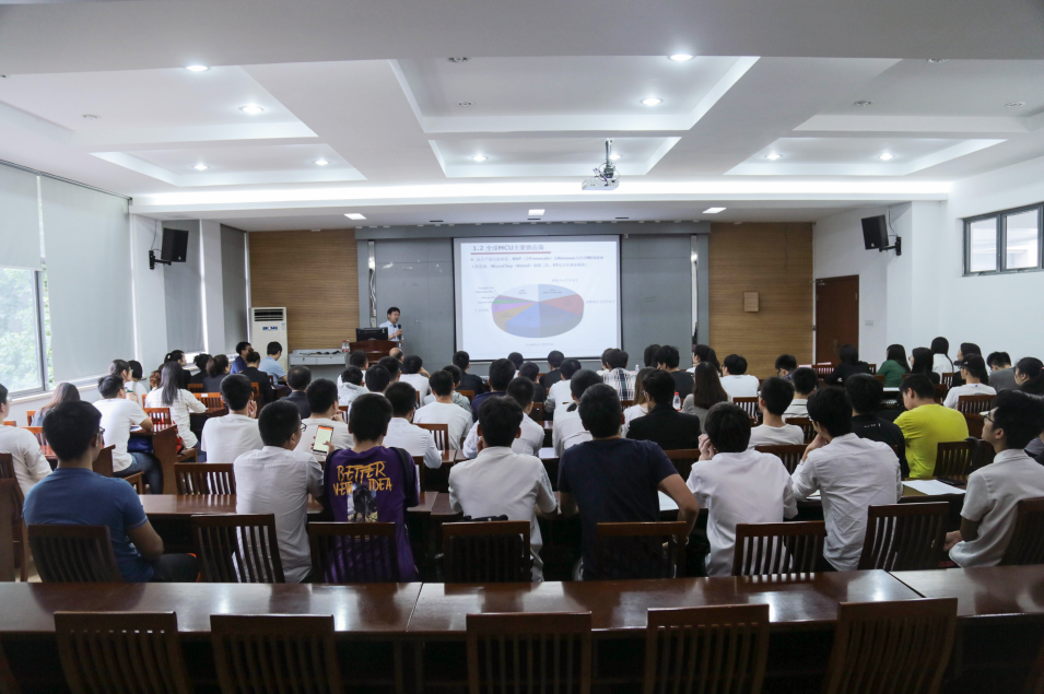随后双选会正式开始。三家企业展开了激烈的宣讲竞争,都希望在座学生能够加入自己队伍。无锡新洁能股份有限公司负责人分别从公司概况,产业链定位,行业地位,研发团队,研发实验室,研发能力等各个方面进行了详细的介绍,热切希望同学们能够积极踊跃的报名加入新洁能/电基集成大家庭;无锡九科芯微电子有限公司负责人分别从MCU发展概述,公司情况介绍与学生培养思路三个方面进行讲述。其中,在学生培养方面,实行导师负责制,有专门的近20年从业经验的老师带领,一个老师带1-2名学生。学生在动手前,会做一些培训,比如Keil的应用,电路的分析,仿真环境的搭建等;南麟电子股份有限公司负责人首先对能够受邀加入卓越工程师计划的表示感谢,随后幽默风趣的介绍了加入贵公司的良好待遇,并热烈欢迎同学们加入南麟大家庭。