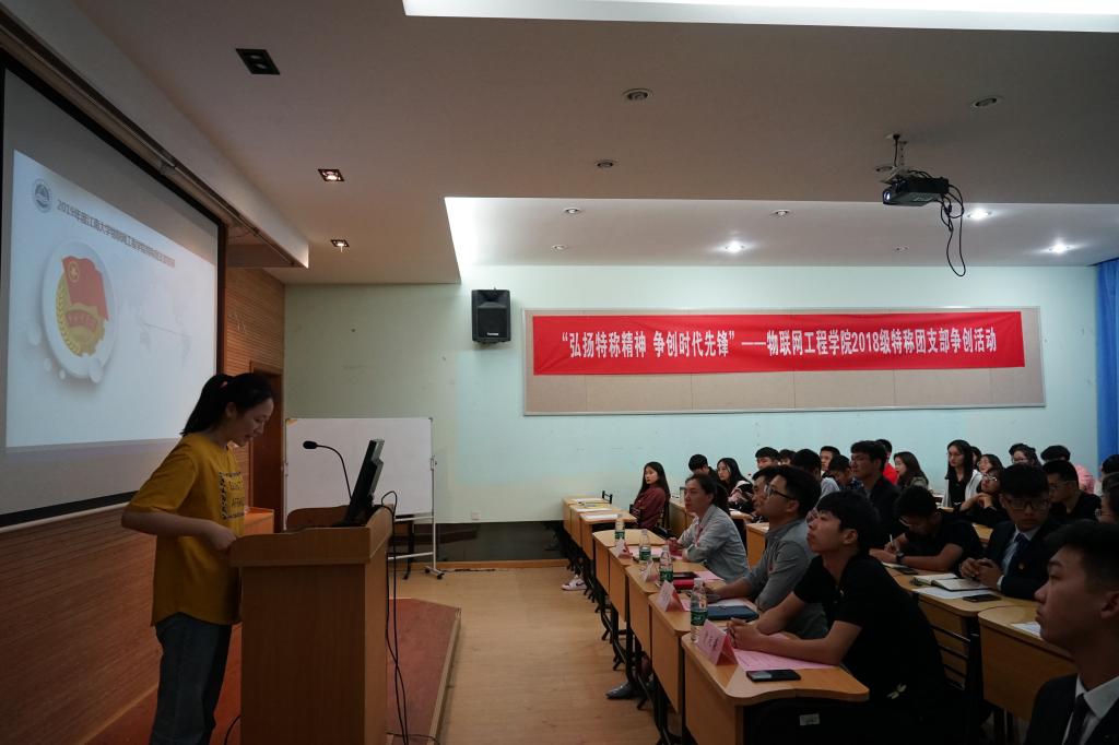 活动伊始,所有人起立奏唱共青团团歌。接着由自动化1804、自动化1805、自动化1806、通信1801、通信1802、计算机1803、计算机1805、物联网1803共8位团支书依次通过PPT展示,汇报了一年来的团建成果。各团支部主要从团支部班团一体化建设情况、支部学习情况、主题教育活动开展情况等方面做了汇报和展示,同时对“信仰公开课”、“精品团课”等主题团日活动的开展形式、开展过程及其成果做了重点介绍,并展示了团结奋进,和谐尚行的团支部风采。在此过程中,三位老师结合各团支部学习成果、主题教育落实和活动开展情况提出了问题,各团支部结合自身特点做了详细的回答,更加详实的介绍了支部团建工作的具体情况,受到评委老师的肯定。