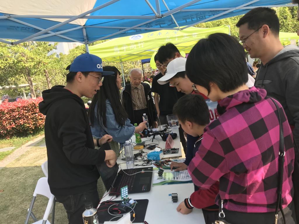 活动开始,各个学院的分科协均设置了有自己学院特色的展台,也分别设计了许多参与性强的小游戏以及准备了许多精美的小礼品以激发群众的兴趣。在活动开展期间,有许多老教师前来围观,他们热情地参与进来,并给学生提出很多具有建设性意义的建议。在各个展览点前总是围着许许多多的社区群众,他们充满好奇地听着我校同学对相关展品进行的讲解,并向讲解者提出关于展品工作原理等的一些问题,同学都耐心地一一解答。另外,还有众多小朋友及其家长参加到寓教于乐的小游戏中来,通过这些科学小游戏,他们既收获了知识也拿到了自己心仪的小礼品。活动结束时,参与的群众均在轻松快乐的氛围中学到科学知识并对科学产生了浓厚兴趣。