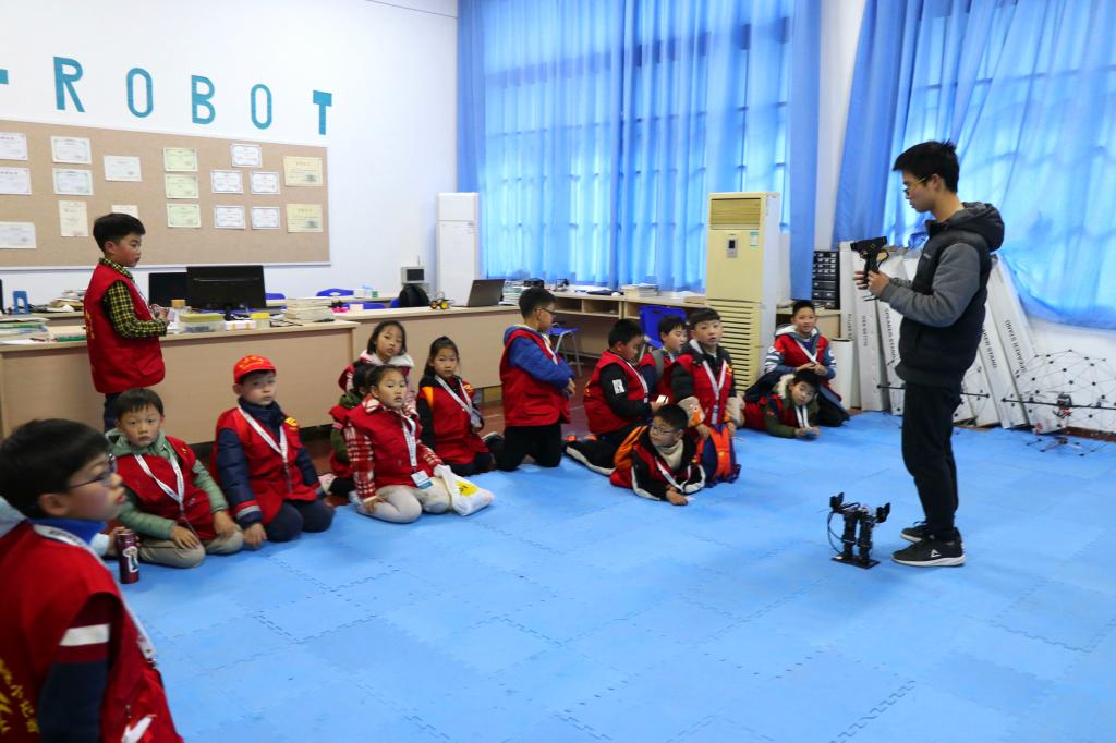 接着便是参观机器人俱乐部。刚看完机器人视频的小记者们终于有机会一睹真正的机器人。小记者们围成一圈,有序观看机器人各种不可思议的动作。最后,工作人员带领小记者有序参观智能车俱乐部,还耐心地向小记者们讲解智能车相关知识。