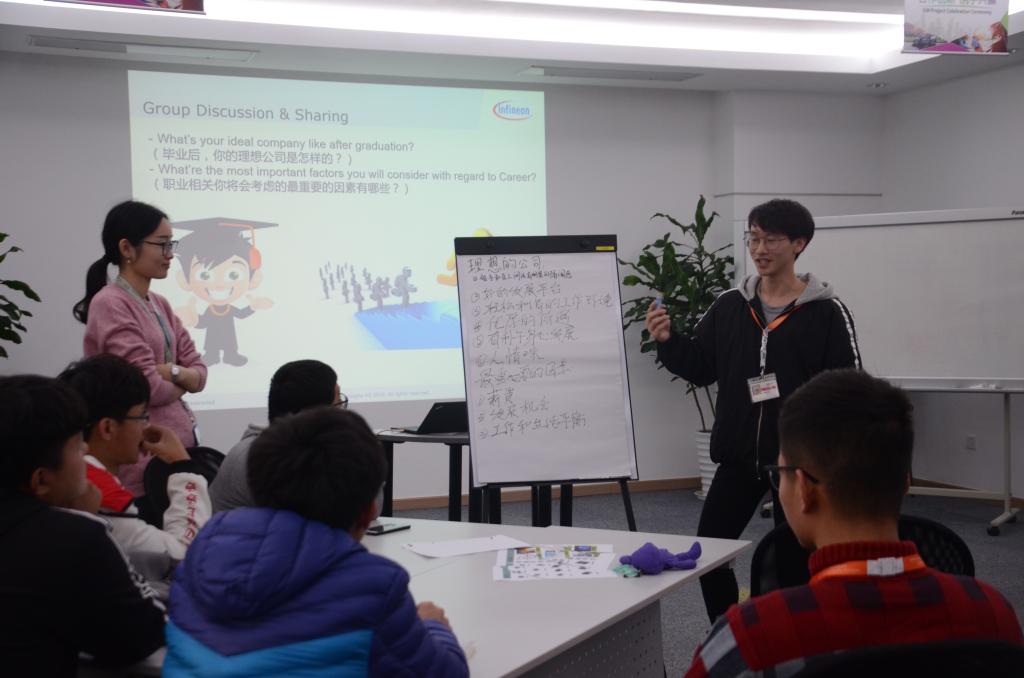 全体参观人员于下午1:30到达英飞凌科技(无锡)有限公司,由人力资源部专员朱玉兰女士接待营员到会议室,详细地为营员们介绍了其以质量为先导的企业文化,承诺、合作、创新、行动的企业价值观以及公司在半导体行业的地位与优势和对于不同产品多样的封装形式与测试流程。公司还特别安排了校友面对面交流分享会和交流互动活动,三位毕业于Bwin必赢平台入口的学姐从不同的角度指导了营员们如何把握学习时间,如何为就业做准备,如何平衡工作与生活,如何在工作中提升自己等问题。