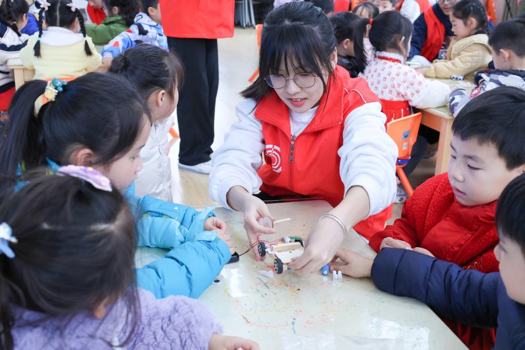 为了让小朋友们更直观地体验芯片的科技之美,课堂上还设置了“声控智能小车”的动手实践环节,在志愿者的指导下亲身探索芯片奥秘。组装车架、对接电线、粘贴芯片模组、固定齿轮、安装电池,小朋友五人一组,如火如荼地动手“施工”。安装结束后,随着此起彼伏雷鸣般的掌声,智能小车应声而动、徐徐前进,车顶的芯片骄傲地向众人展示它的神奇科技“魔法”,引来小朋友阵阵欢呼。