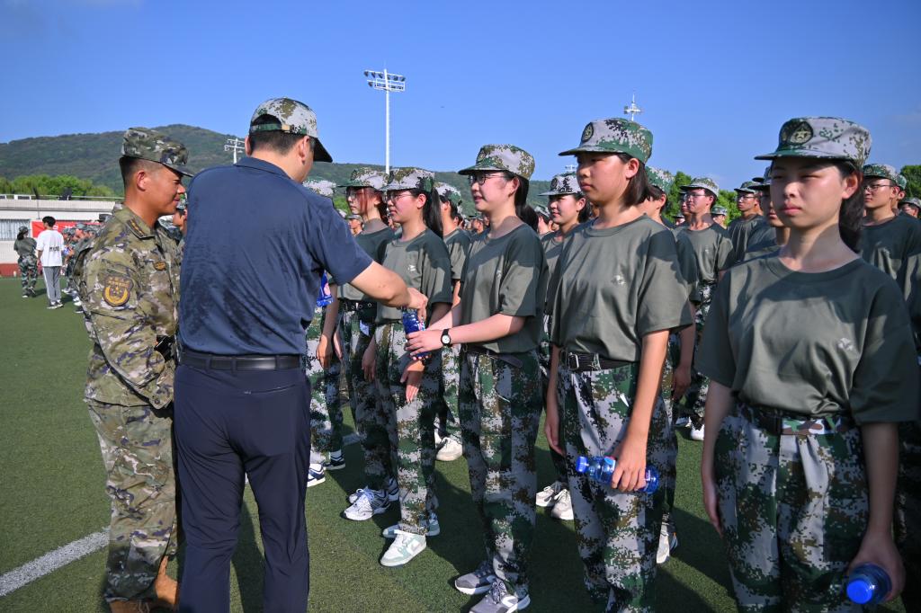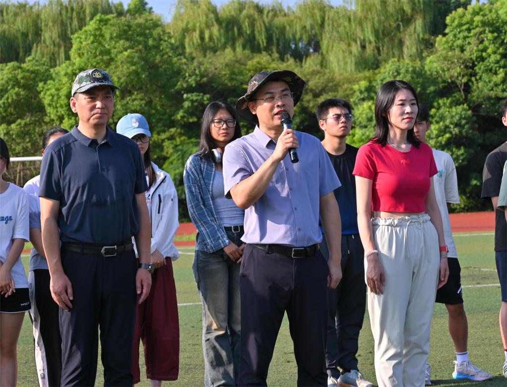 俞立峰代表学校对物联学子表示慰问与肯定,鼓励全体参训人员继续保持良好的训练状态,坚持高标准、严要求,积极投入军事训练,磨炼意志品质和身体素质,期待大家在不久后的全校军训成果汇报中展示丰硕成果。