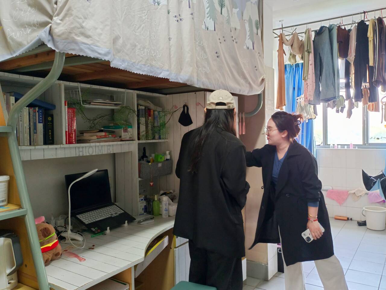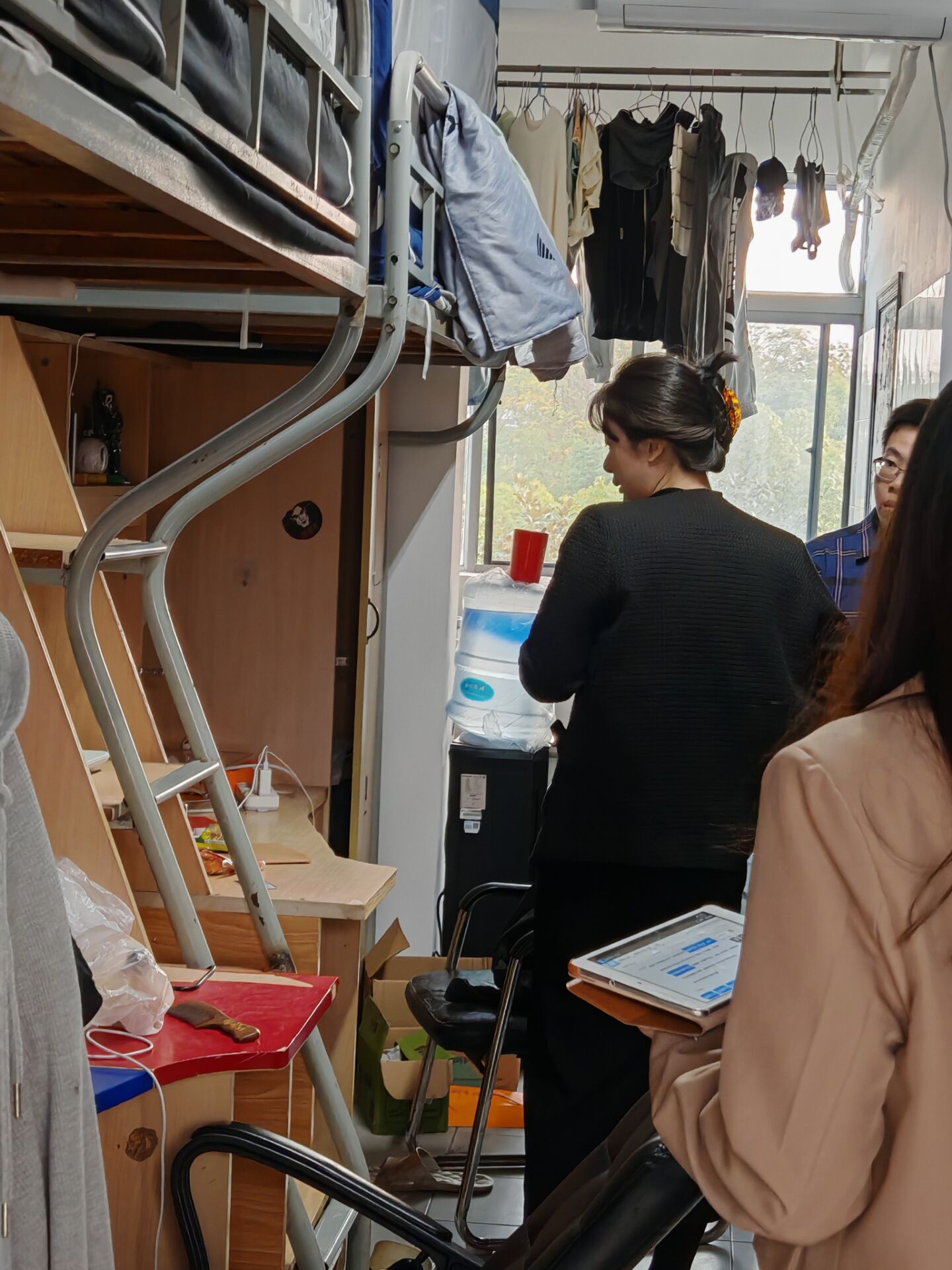 期中走访,共话生活点滴。临近期中,辅导员们将走访重点放在了同学们的学习计划和心理状态上。他们深入了解同学们的学习计划、目标设定以及遇到的困惑,为同学们提供个性化的学习建议和心理支持。过程中,多数宿舍都展现出了良好的卫生状况和整洁的居住环境,同学们以积极的态度面对大学生活,尊重并维护着宿舍文化。他们纷纷表示,将珍惜学校提供的良好学习和生活环境,努力提升自己的综合素质和能力水平。