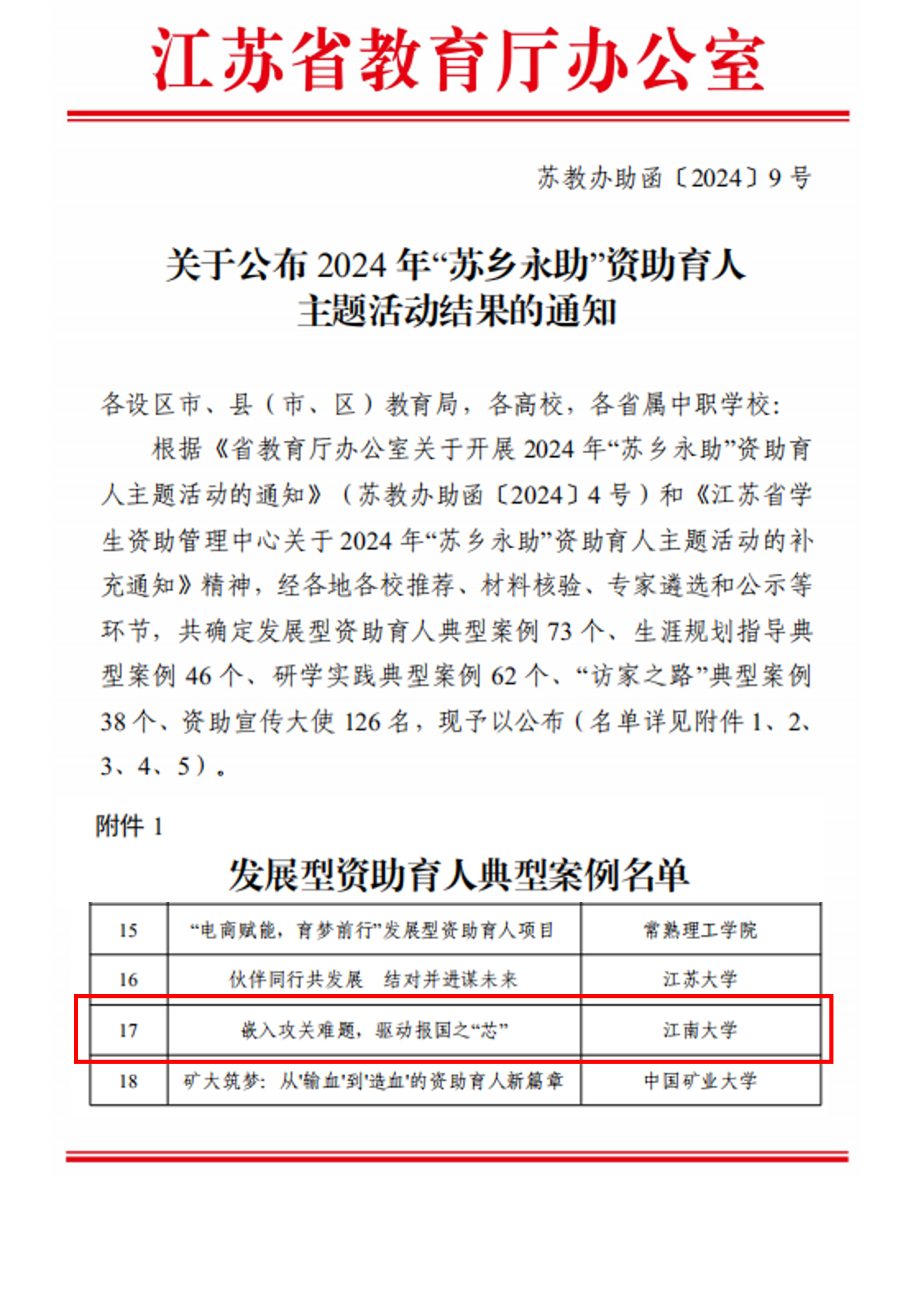日前,江苏省教育厅组织开展的2024年“苏乡永助”资助育人主题活动评选结果公布,bwin·必赢唯一官网报送的《嵌入攻关难题,驱动报国之“芯”》(作者:王雪冰)获评发展型资助育人典型案例,此案例是本次我校选送的唯一获选案例。