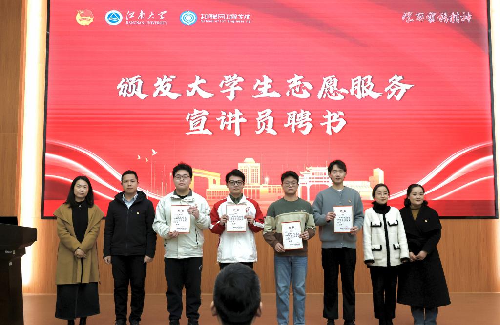 聘书颁发环节,校团委副书记单云婷、bwin·必赢唯一官网党委副书记吴妍、无锡市滨湖区团委副书记肖江,校学生工作处学生管理科科长杨艳共同为四位优秀的物联追“锋”者颁发“大学生志愿服务宣讲员”聘书,激励四位宣讲员肩负起传播志愿服务精神的重任,以自身经历激励更多同学投身志愿服务。