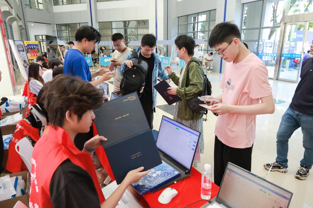在迎新现场,学院特别设置了三大特色体验区。“新生寄语墙”上,410位本科新生的姓名巧妙组合成“唯实”院训,寓意逐梦的起点,承载青春的期许;“科创体验区”汇聚了物联学子历届科创竞赛成果,智能小车、创新作品引燃新生的科技热情;“传感互动区”通过体验惊喜刮刮乐、指纹成长树等特色活动,让新生在每一次的划动、点触中感受到学院最美好的祝愿。此外,学院还组织起一支热心的志愿者服务队,穿梭于报到现场与宿舍园区,耐心地向新生提供引导、指示和答疑等服务,用实际行动传递着学院最真挚的关怀与温暖的问候。