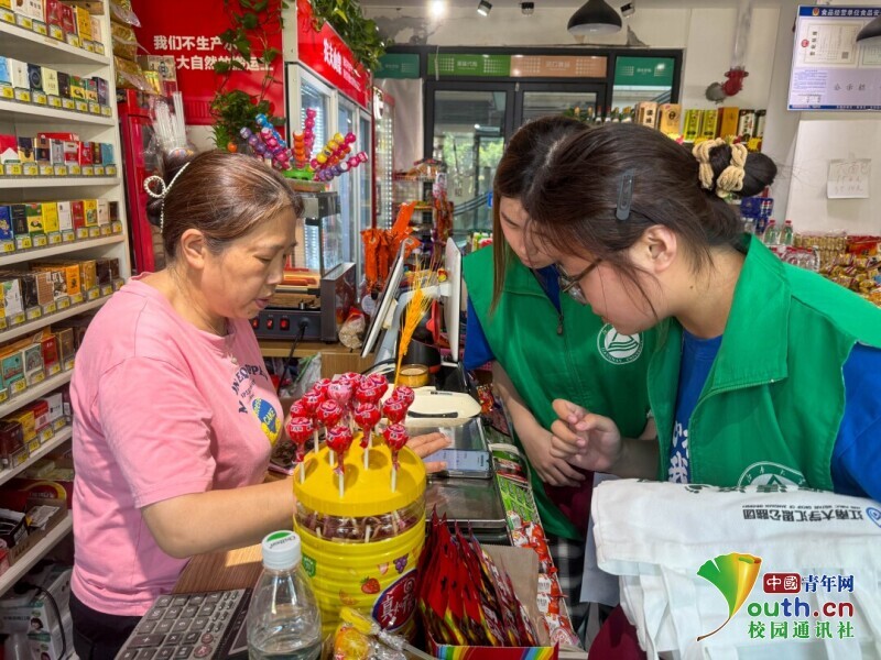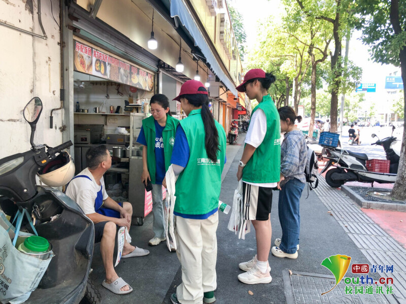 图为实践团成员对河两岸商铺进行环保倡议并发放环保袋。孙涵 供图