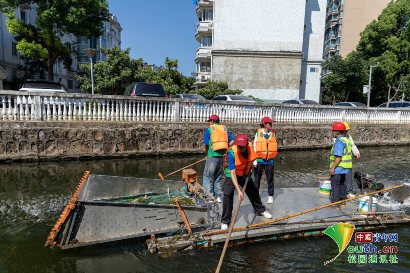 图为实践团成员在专业人员的指导下完成河内水草的打捞。孙涵 供图